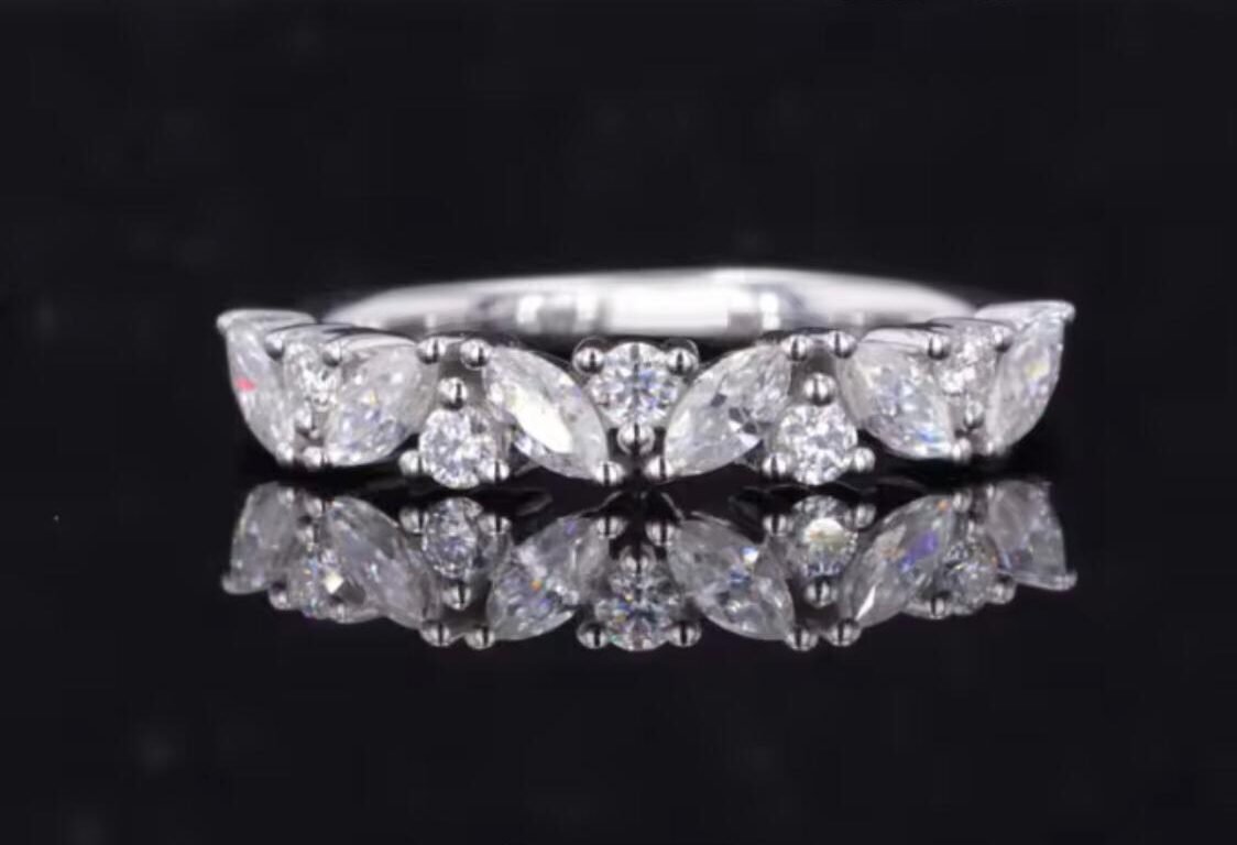 Introducing our exquisite 14k White Gold Band, a masterpiece that beautifully blends sophistication and modern elegance. This stunning piece features a captivating combination of sparkling marquise lab diamonds 2x5mm and radiant round lab diamonds 2mm creating a mesmerising display of light and brilliance that’s perfect for any occasion.