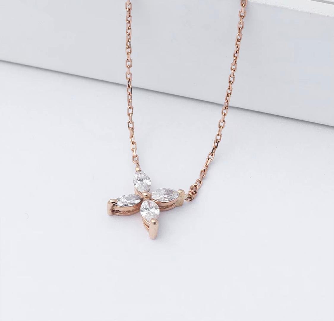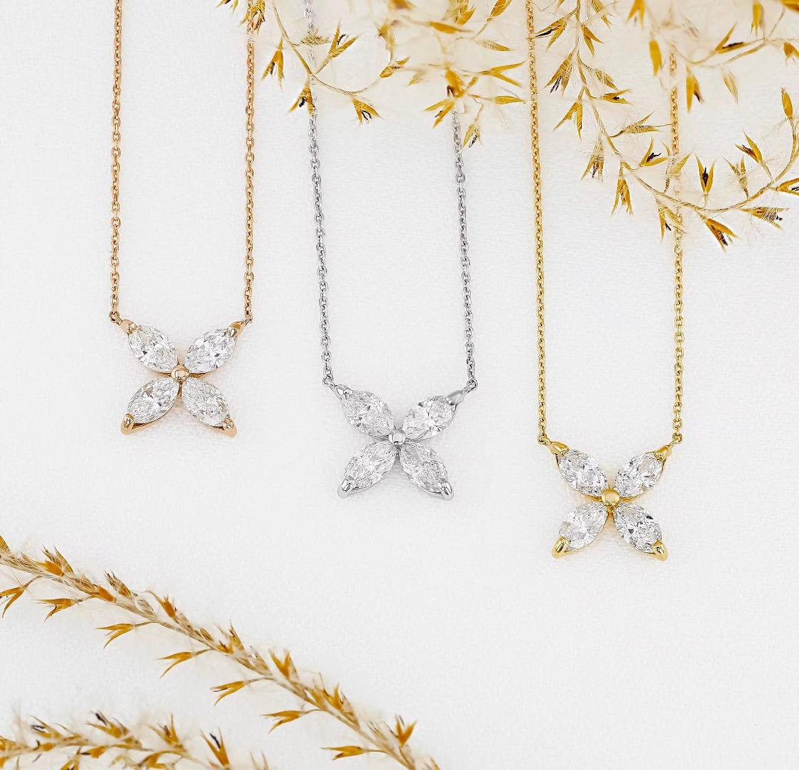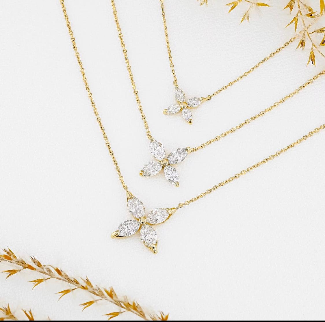 Elegant Floral Pendant, a captivating piece that beautifully showcases the brilliance of four marquee diamonds, expertly set in a luxurious 18 Carat Gold Claw Setting.