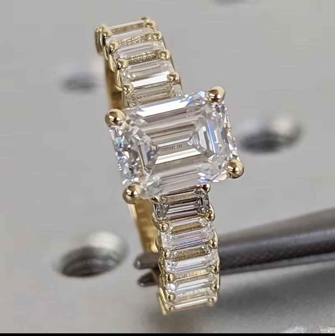 A breathtaking 18-karat yellow gold engagement ring. Its centerpiece, an exquisite emerald-cut emerald, shimmers exuding elegance and timelessness. Flanking the stunning centerstone are matching emerald-cut diamonds, each sparkling brilliantly like tiny prisms of frozen light, complementing the vivid beauty of the emerald. The warm golden band, polished to perfection, reflects the brilliance of the gemstones, creating an aura of opulence and romance. The composition of this masterpiece radiates class, luxury, and enduring love – a true testament to unparalleled craftsmanship.