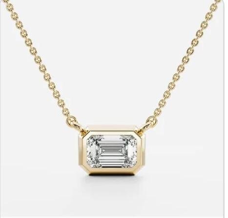 A mesmerizing emerald-cut solitaire gemstone, encased in a sleek, modern bezel setting.Suspended horizontally along a delicate, yg chain that shimmers under soft lighting, the pendant emanates elegance and timeless allure. The minimalist design pairs a contemporary aesthetic with the allure of classic luxury, creating a piece that feels like it could belong to a royal treasure trove or a futuristic fashion runway. Stone sizes starting from 0.50ct Dia