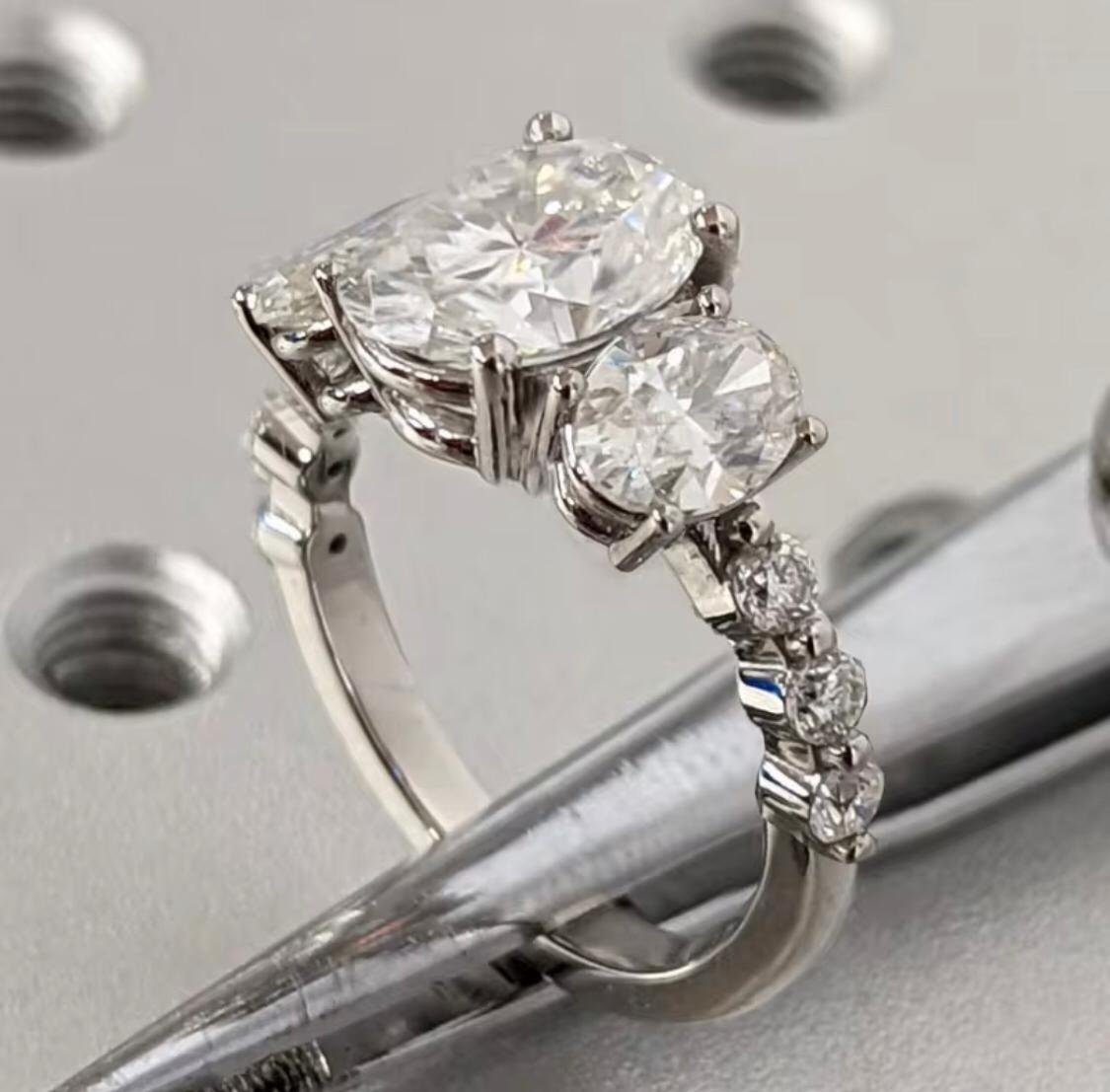 A centrepiece of elegance a Lab-Grown oval diamond ring shimmering in the light, flanked by two smaller oval diamonds followed by a trail of round diamonds.