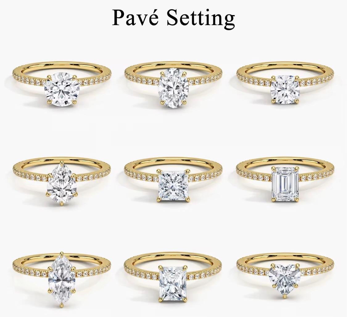 Craft a mesmerizing image of an elegant diamond ring, with a flawlessly cut, radiant single diamond at the center radiating brilliance. The band features a luxurious pavé setting, sparkling with a cascade of perfectly aligned, tiny diamonds seamlessly flowing on either side of the centerpiece. The intricate craftsmanship of the design reflects glamour and sophistication, with the shimmer and glimmer catching light from every angle.